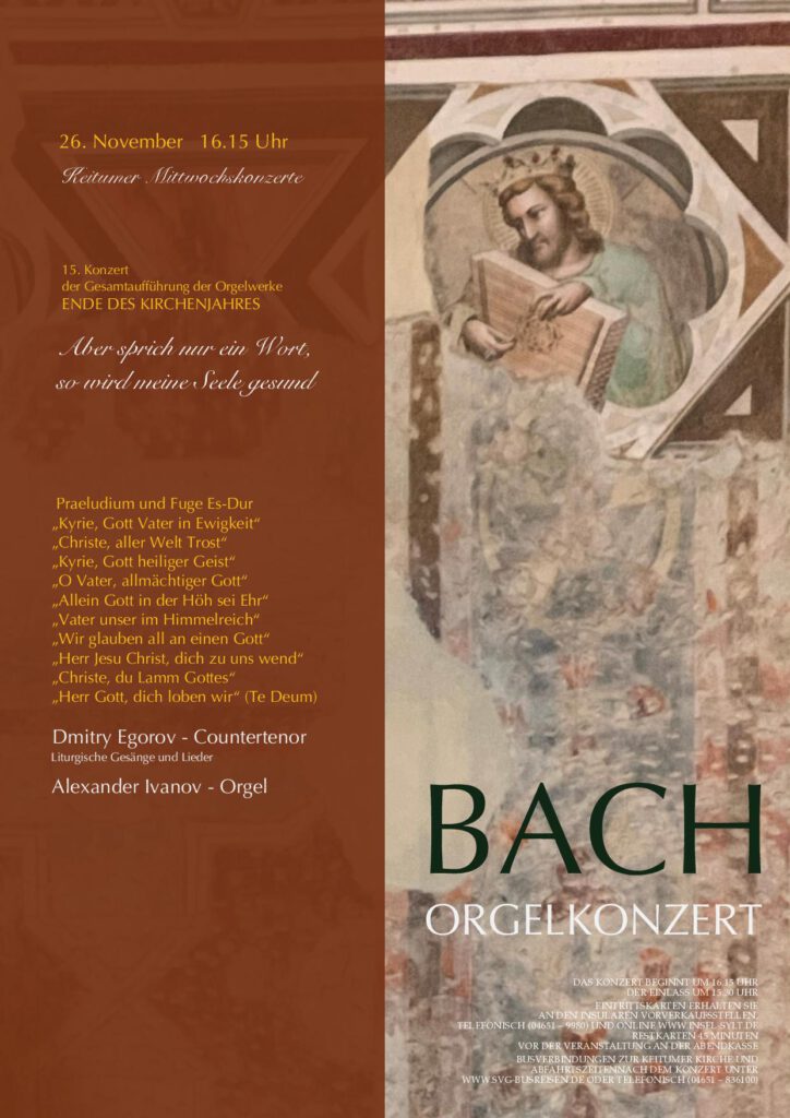 Zum nächsten Mittwochskonzert an St. Severin hat der Keitumer Organist Alexander Ivanov für den Zyklus „Mit Bach durch das Jahr“ Kompositionen ausgewählt, die Johann Sebastian Bach zum Ende des Kirchenjahres komponiert hat. Eingerahmt von Praeludium und Fuge in Es-Dur und dem Trio BWV 655 erklingen Bachs Bearbeitungen geistlicher Choräle zu Glaube, Hoffnung und Trost, begleitet an der Mühleisenorgel von Alexander Ivanov singt der Countertenor Dmitry Egorov.