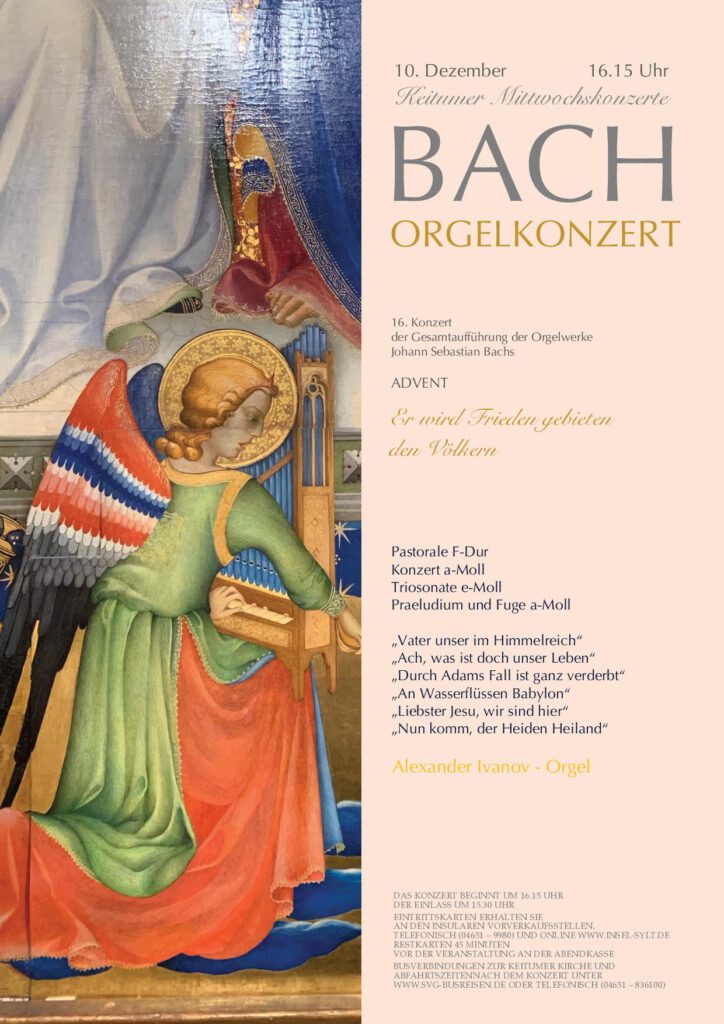 Zum 16. Konzert aus dem Zyklus MIT BACH DURCH DAS JAHR hat der Keitumer Organist Alexander Ivanov Kompositionen von Johann Sebastian Bach ausgewählt, die thematisch zu den Sonntagen der Vorweihnachtszeit gehören. Schwerpunkt an diesem Mittwochnachmittag in St. Severin sind die Choralbearbeitungen zu „Nun komm der Heiden Heiland“, eingerahmt von der berührenden Pastorale in F-Dur und Präludium und Fuge a-Moll, BWV 543.