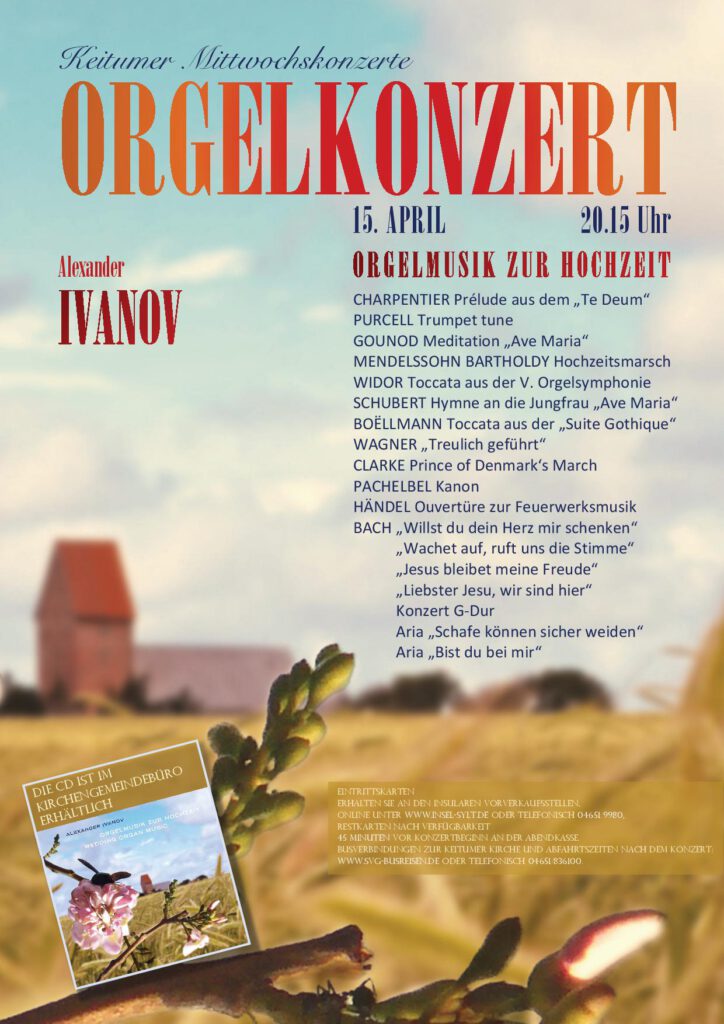 Willst Du Dein Herz mir schenken? Orgelmusik zur Hochzeit – unter diesem Titel hat der Keitumer Organist Alexander Ivanov für das nächste Mittwochskonzert an St. Severin ein Programm rund um das Thema „Heiraten“ zusammengestellt. Jeder Hochzeitsgast kennt den Einzugsmarsch von Felix Mendelssohn-Bartholdy oder „Treulich geführt“ von Richard Wagner – brillante und feierliche Musik von Händel, Charpentier und Purcell, erhabene Werke für die große Kathedrale von Widor und Boëllmann, sowie vertraute und beliebte Kompositionen für diesen besonderen Tag von Pachelbel, Schubert und J.S. Bach.