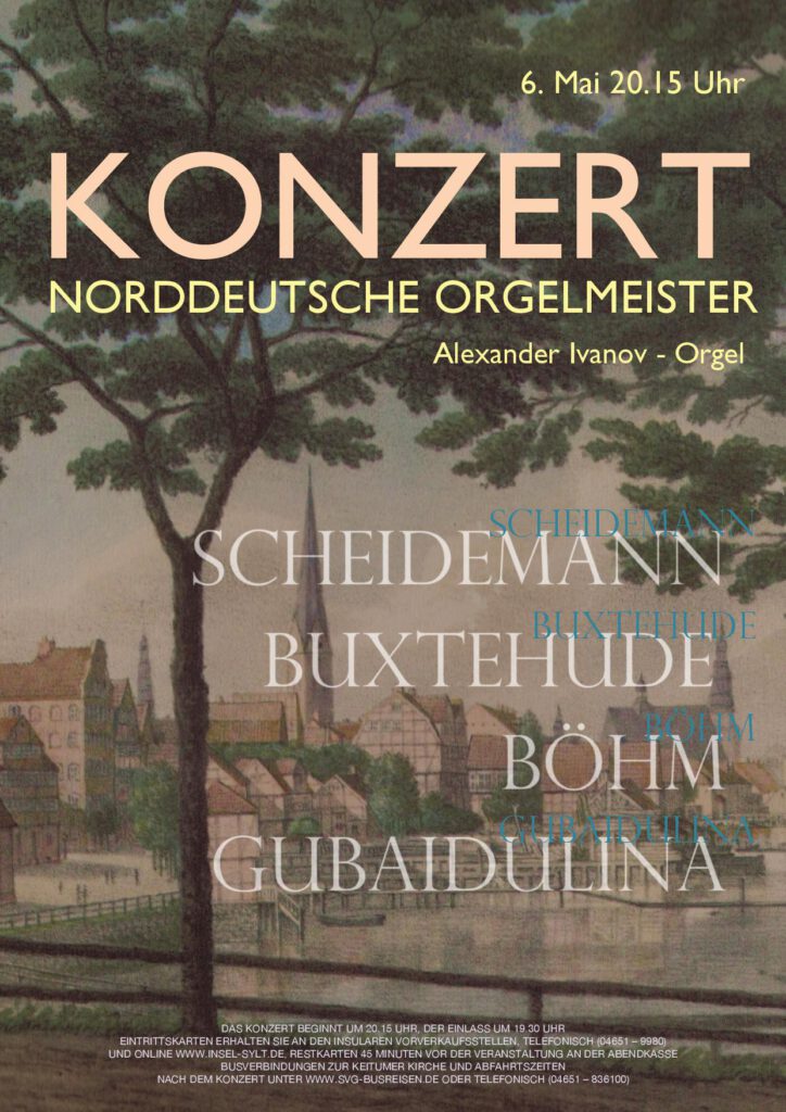Der Titel des nächsten Mittwochskonzerts in der Keitumer Kirche – „Musikalische Gärten“ – verspricht eine ideelle Verschmelzung von Ort, Landschaft und Musik – eingefangen in bewegenden Kompositionen aus fünf Jahrhunderten. Alexander Ivanov spielt an der Großen Mühleisenorgel in St. Severin Werke des Frühbarocks bis zur Gegenwart, von Frescobaldi, Buxtehude, Bach, Franck, Duruflé und Alain.