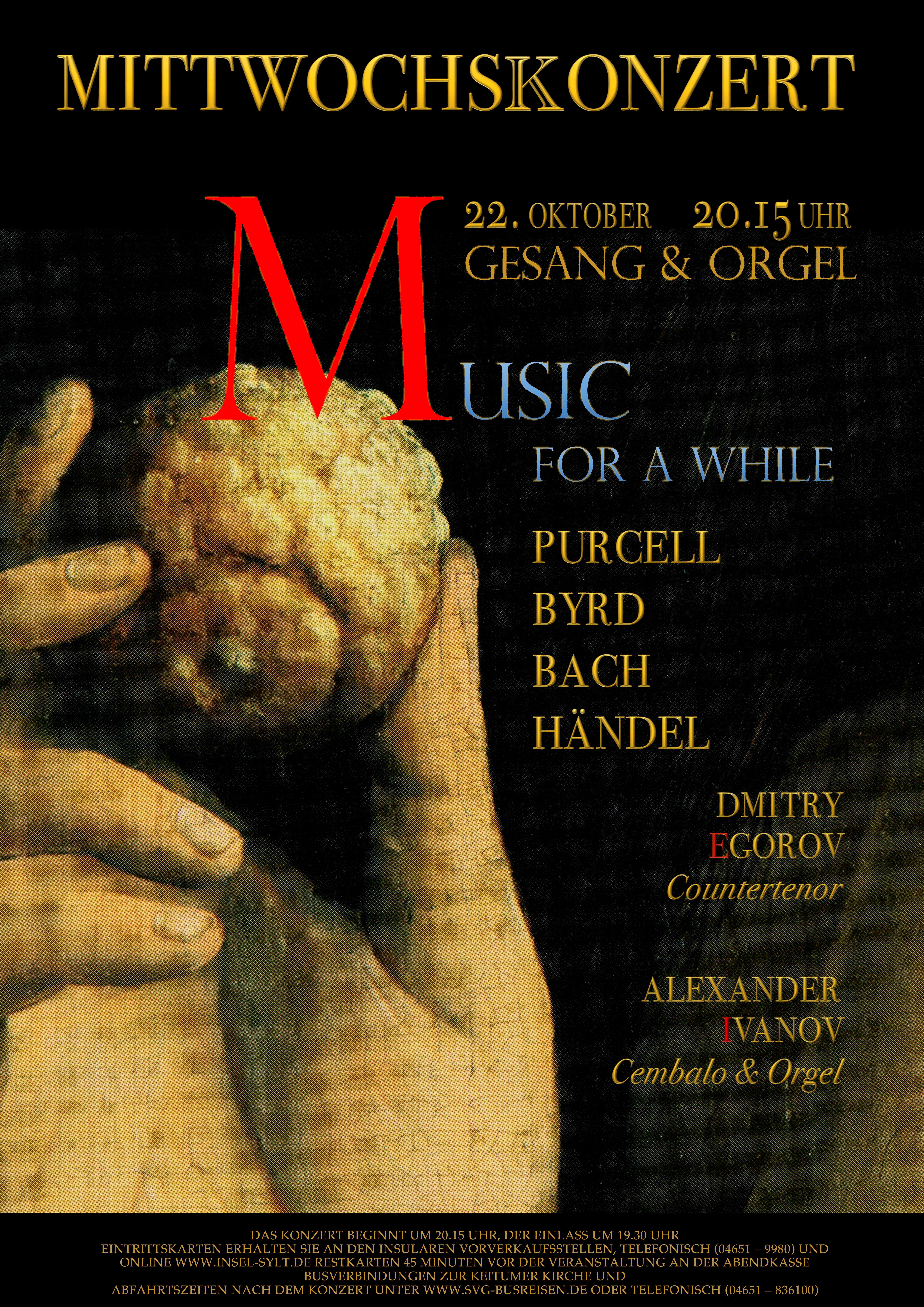 Music for a while – Musik für einen Augenblick – unter diesem Titel haben der Countertenor Dmitry Egorov und Alexander Ivanov an Cembalo und Orgel ein besonderes Programm für das nächste Konzert in St. Severin zusammengestellt. Mit berührenden Liedern und Arien von Bach, Byrd, Händel und Purcell ist dieser Abend ein weiterer kammermusikalischer Höhepunkt der Keitumer Mittwochskonzerte.